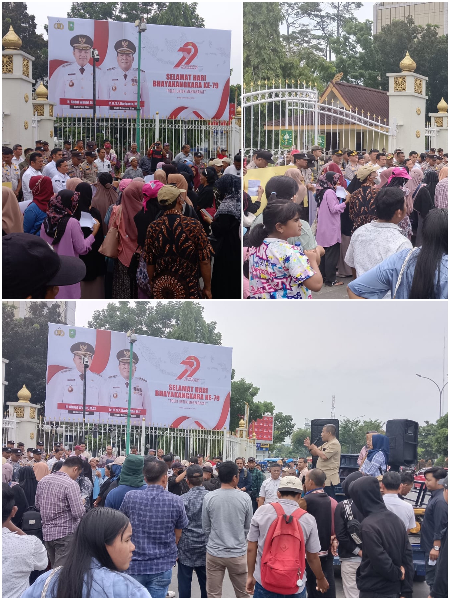 “Bapak Gubernur Abdul Wahid, sudah menginstruksikan kepada kami, untuk mendengarkan seluruh aspirasi dan tuntutan bapak ibu sekalian. Gubernur juga meminta maaf karena tidak dapat menyambut langaung bapak dan ibu karena sedang dinas di luar kota,” terangnya.